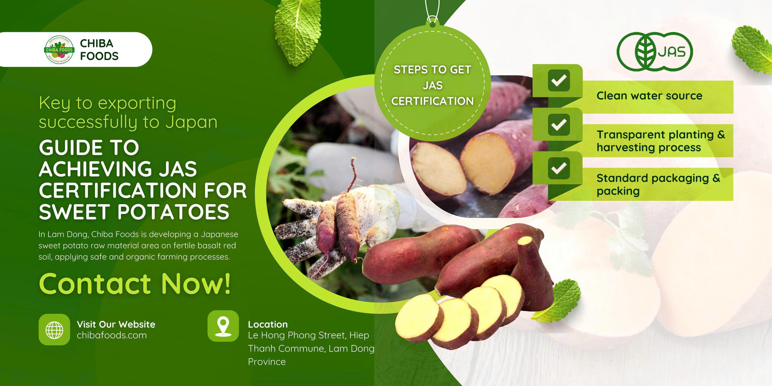 JAS certification is a mandatory requirement for sweet potatoes exported to Japan, ensuring food safety, organic farming, and consumer trust. The article guides Vietnamese businesses and farmers through conditions, processes, and practical tips to obtain JAS certification. With support from Chiba Foods, achieving this certification becomes faster and more effective, helping sweet potatoes enter Japan&rsquos high-end market.